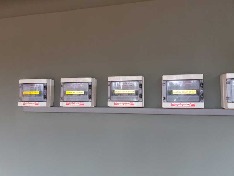 6 x DC combiner protection boxes were installed below the PV array, 4 for use (15 x 330 watt PV modules per combiner) and 2 spare that were put in place for future expansion of the solar array.
