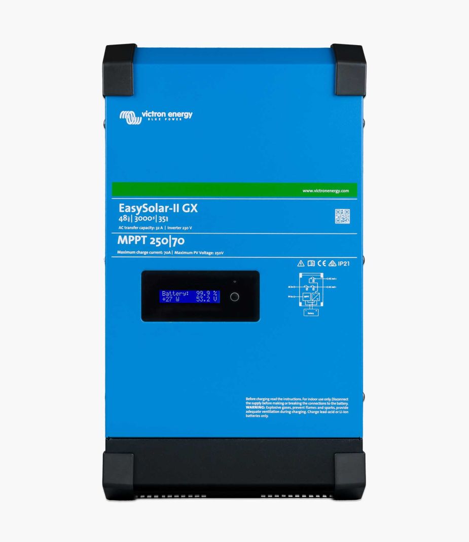 Standard Level 3: 5000VA Victron Energy EasySolar-II inverter (Nersa Approved) with 5.8kWp solar (PV) ready, includes 5120Wh LiFePO₄ battery, AC in/out (1 & 2), surge & DC/AC protection, full remote management, compact with no messy wires. Factory-optimized. 5-Year Warranty