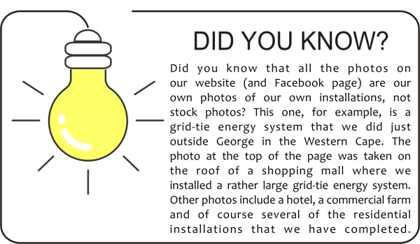 In the video above the installation was done on a farm just outside George in the Western Cape that grows, packs and exports fruit. Now they save on electricity costs too!